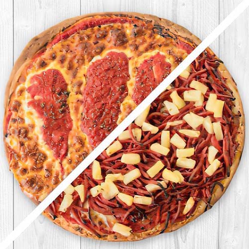 Tomato base, mozzarella, ham, pepperoni, pineapple, shrimp